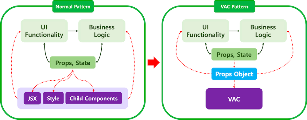 VAC 패턴은 View 컴포넌트에서 JSX 영역을 Props Object로 추상화하고, 비즈니스 로직컴포넌트와 View 컴포넌트를 따로 관리한다.